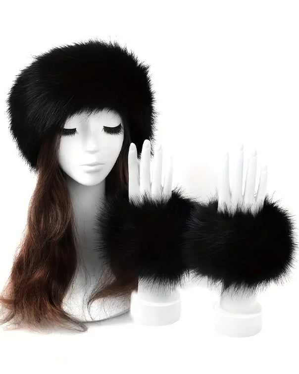 2pcs Set Solid Color Acrylic Fuzzy Beanie Hat And Cuffs