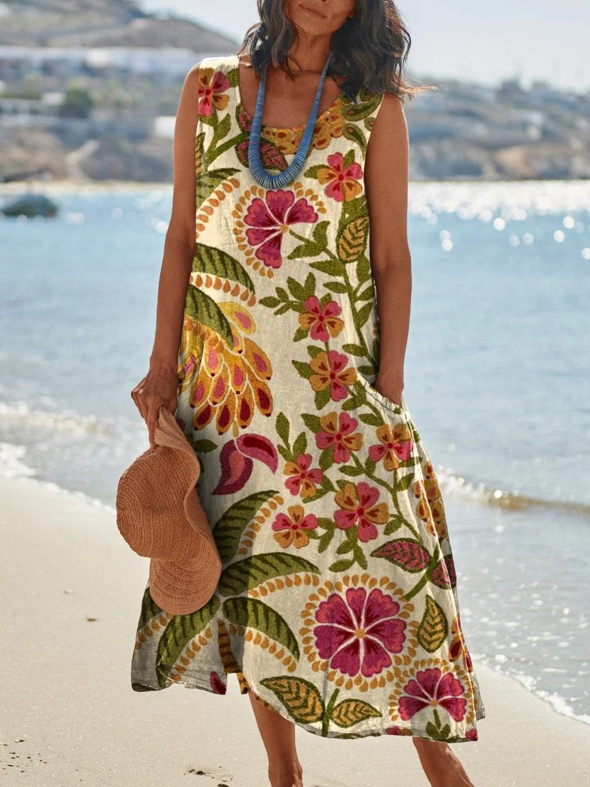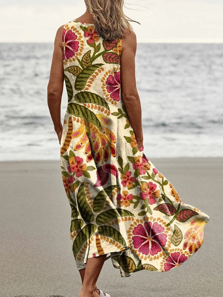 Retro Floral Print Pocket Crew Neck Vest Dress