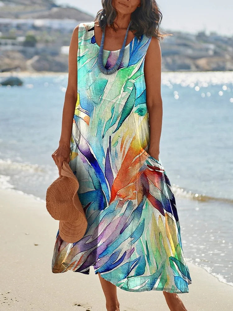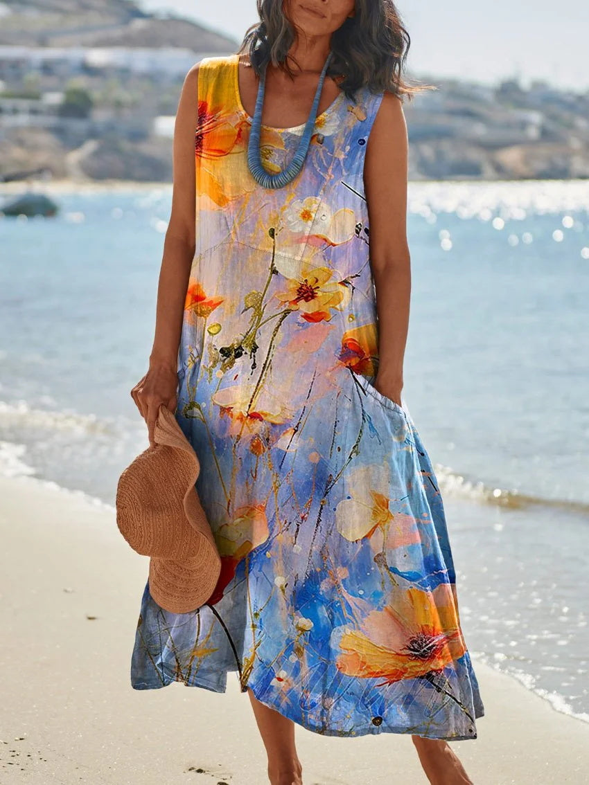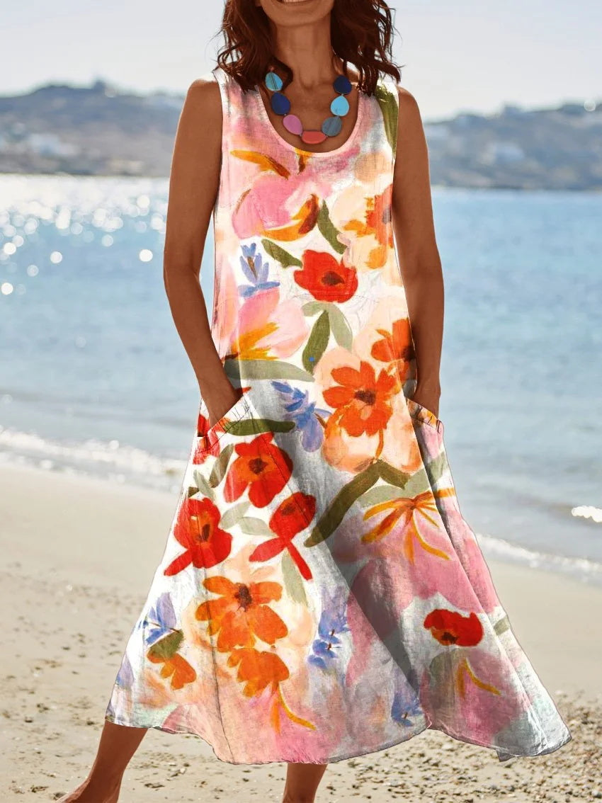 Watercolor Floral Print Pocket Round Neck Vest Dress