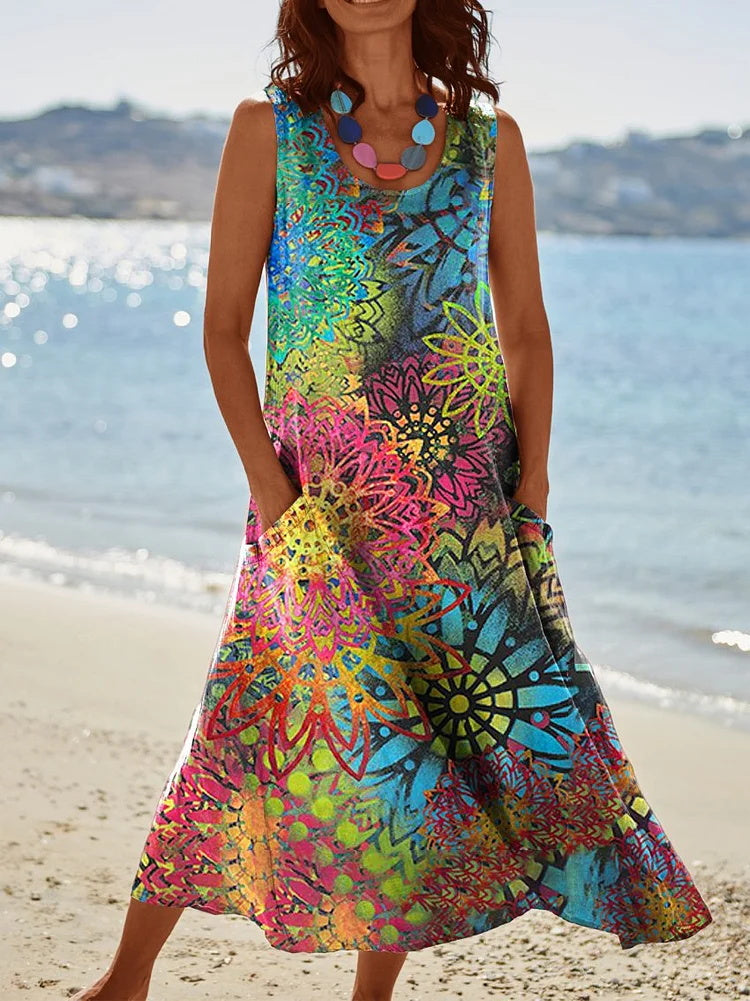 Mandala Geometric Print Pocket Crewneck Vest Dress