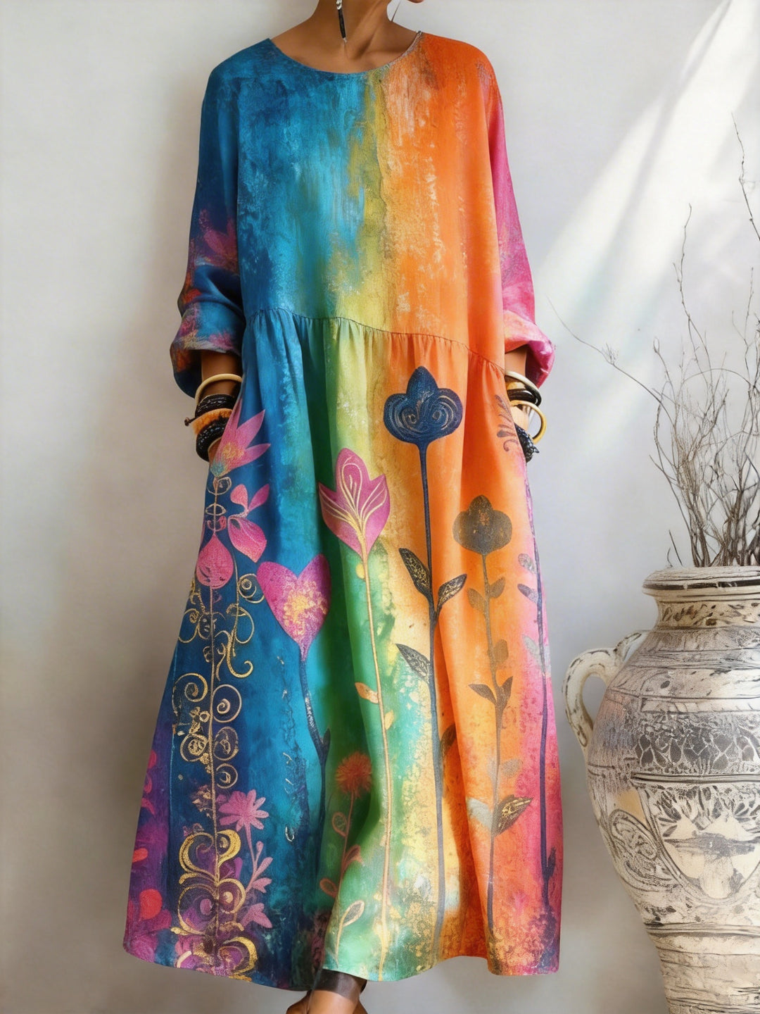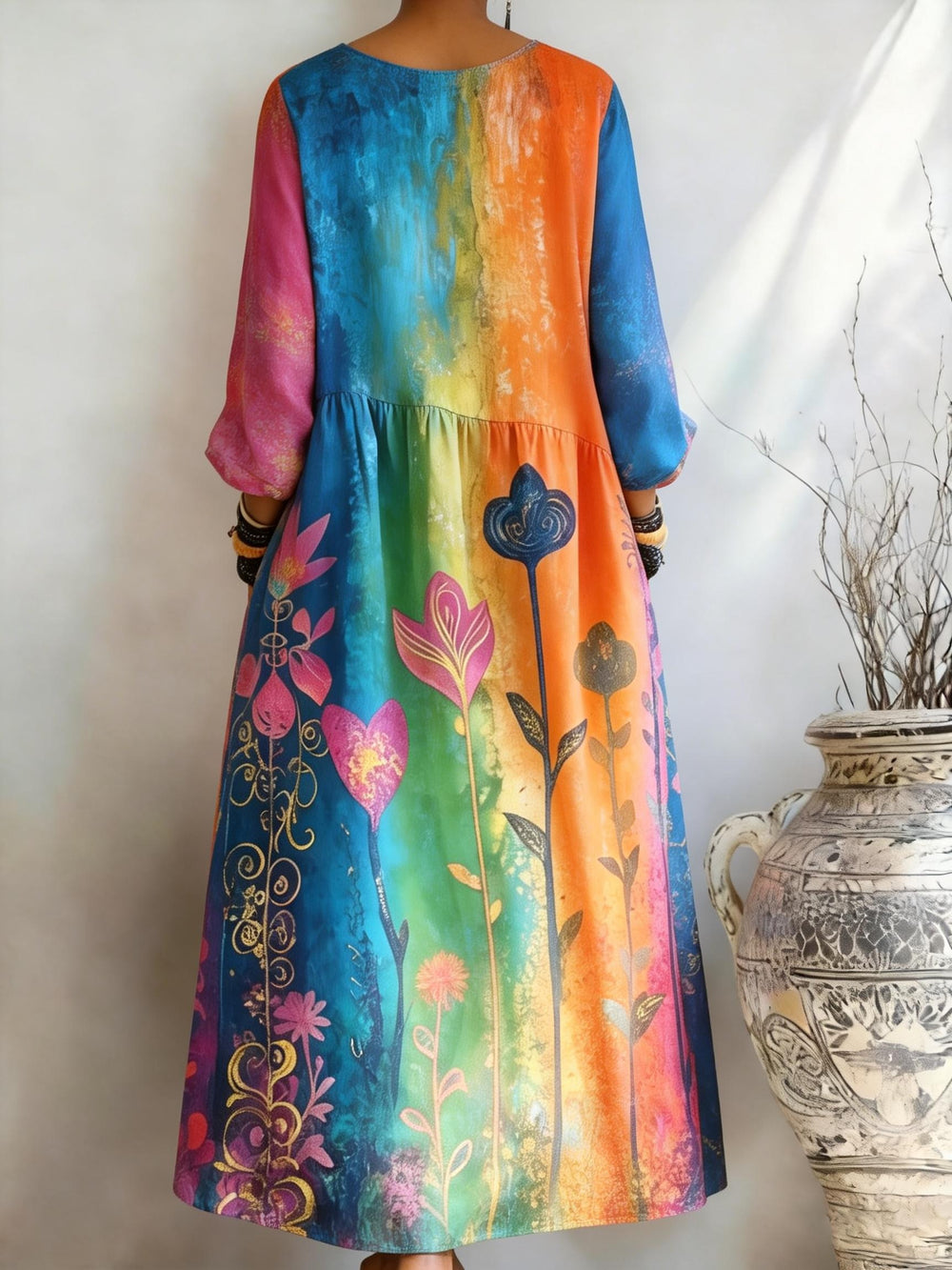 Vintage Rainbow Gradient Watercolor Floral Print Pocket Dress