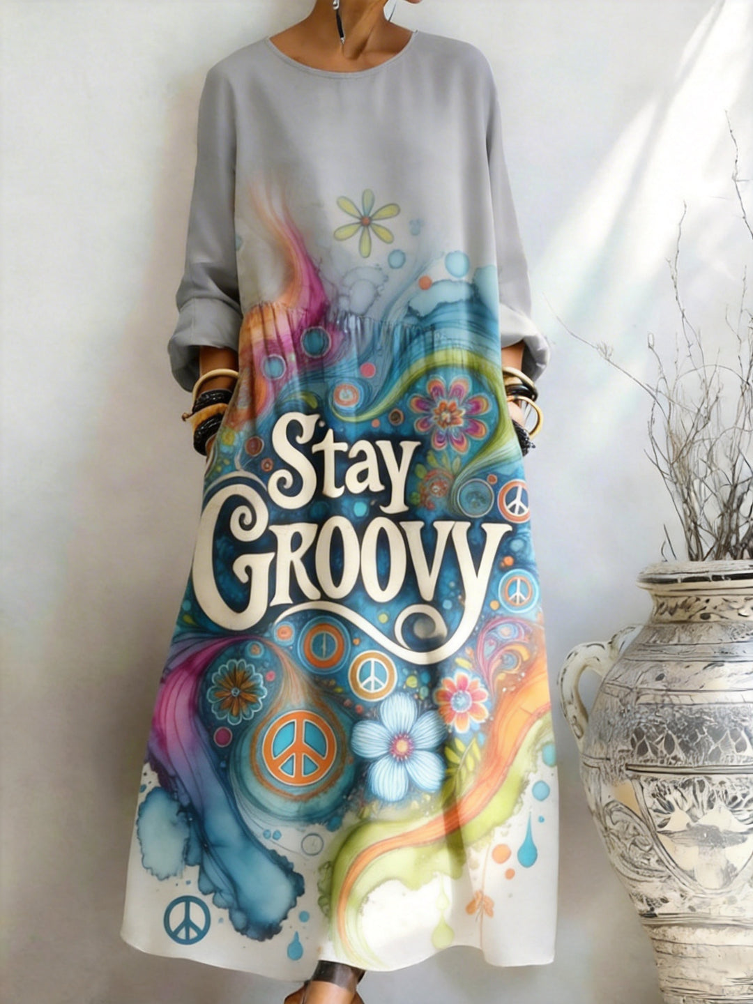 Gradient "Stay Groovy" Peace Symbol Floral Print Pocket Dress