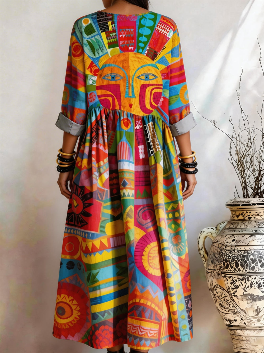 Colorful Abstract Face Print V-Neck Elegant Dress