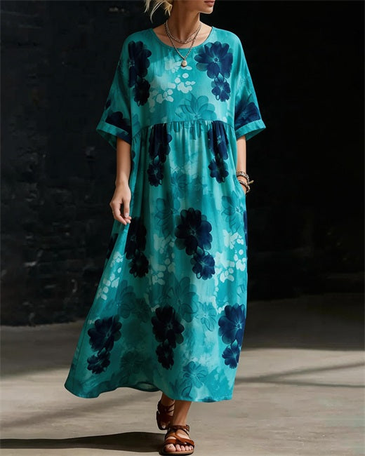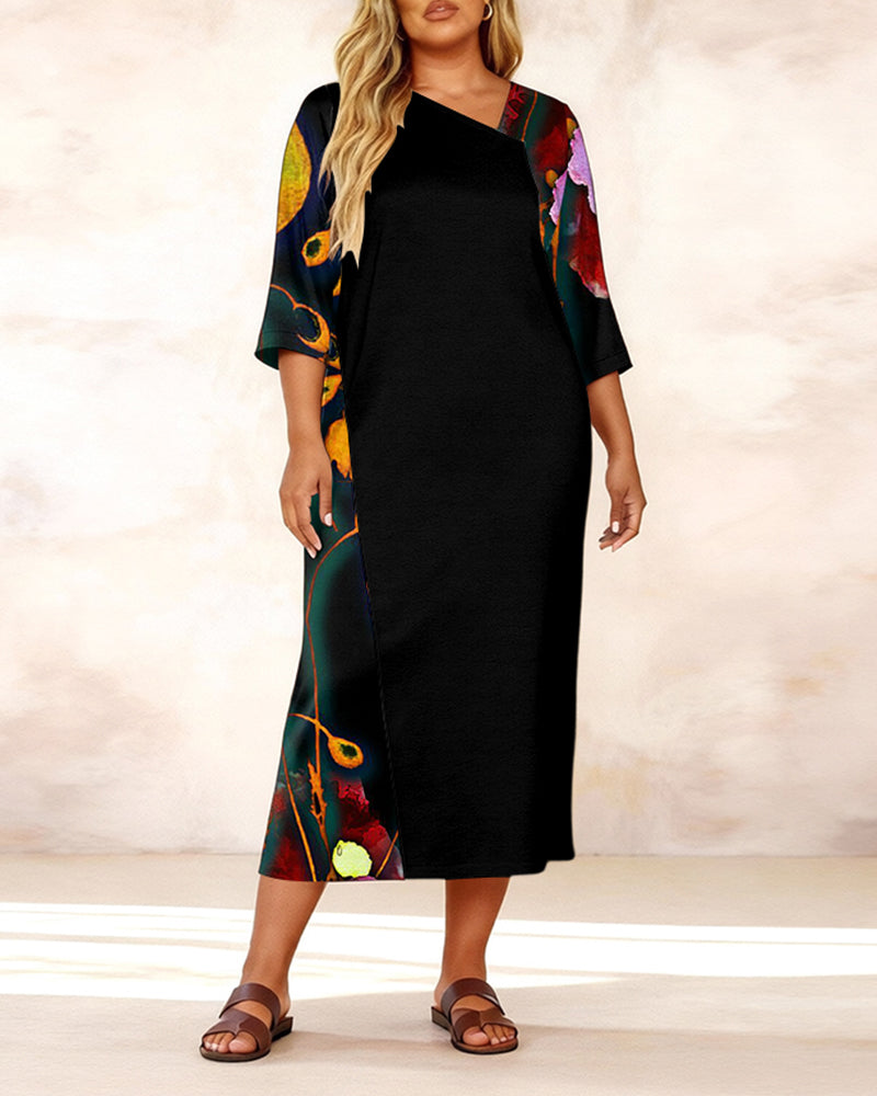 Irregular Neckline Abstract Floral Print Mid-sleeve Straight Maxi Dresses