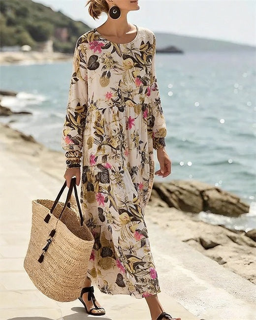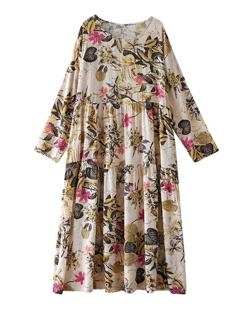 Vintage Floral-Print Long Sleeve Large-Swing Dress