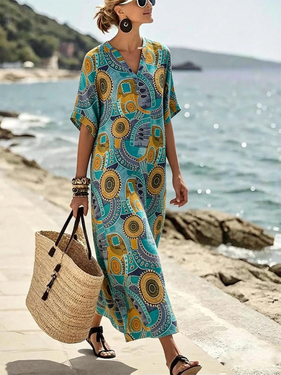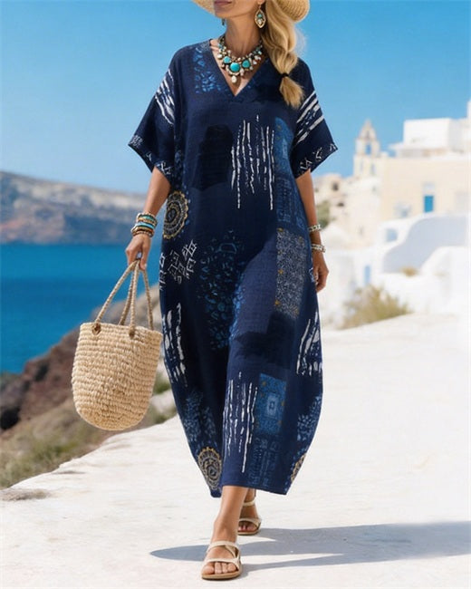 Vintage Ethnic Abstract Print V-Neck Dress