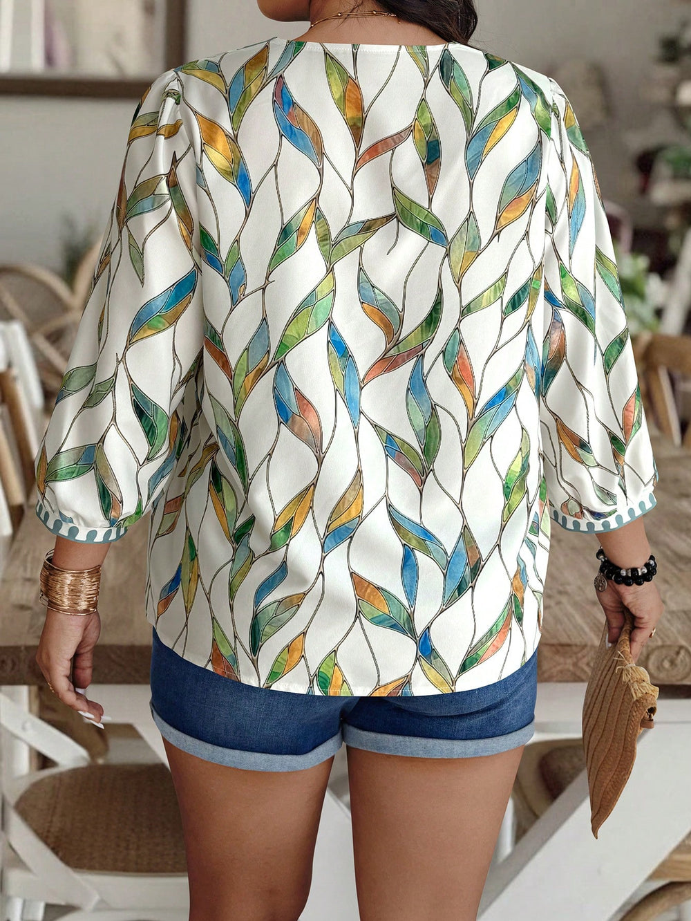 Colored Leaf Contrast Printed V-Neck Puff Sleeve Top