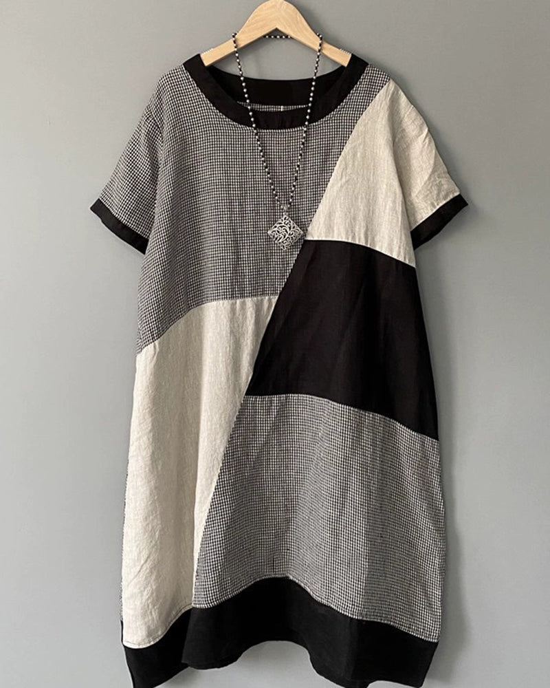 Vintage Linen Contrast Color Stitching Dress Large Size Midi Dress