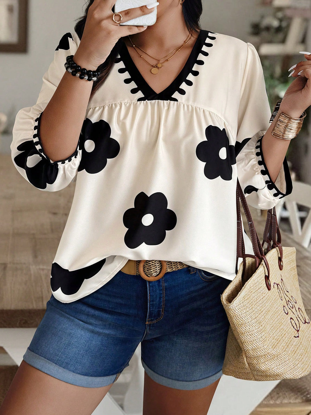Black And White Large Floral Print V-Neck Puff Sleeve Top