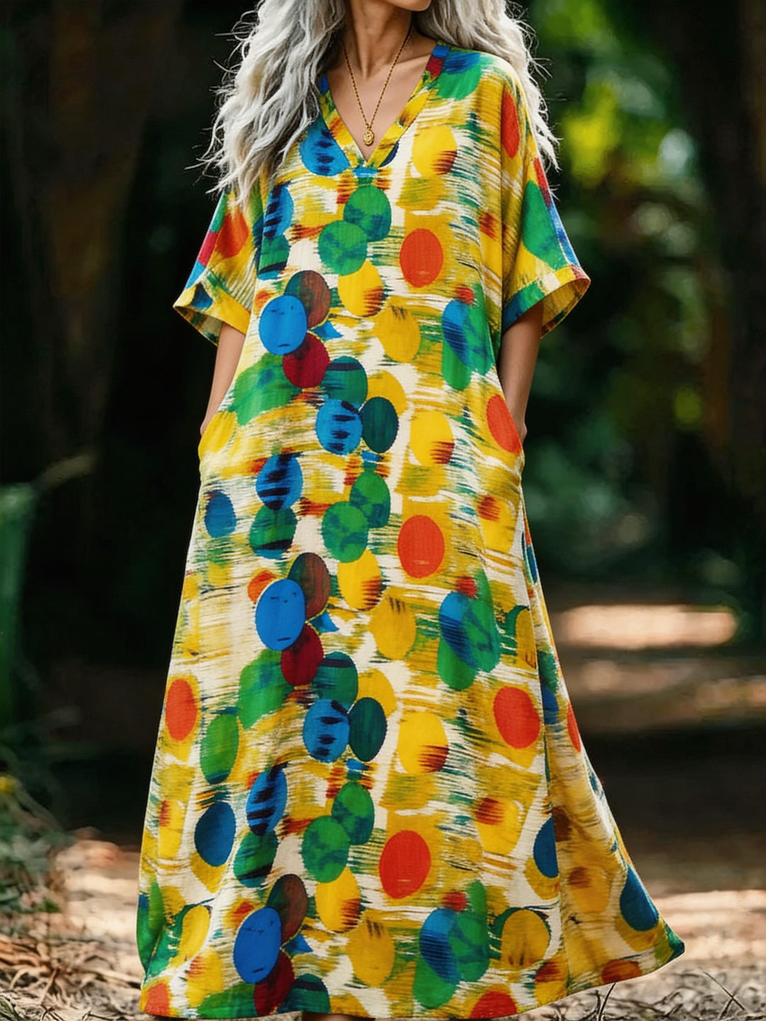 Colorful Polled V-neck Cotton-linen Loose Dress