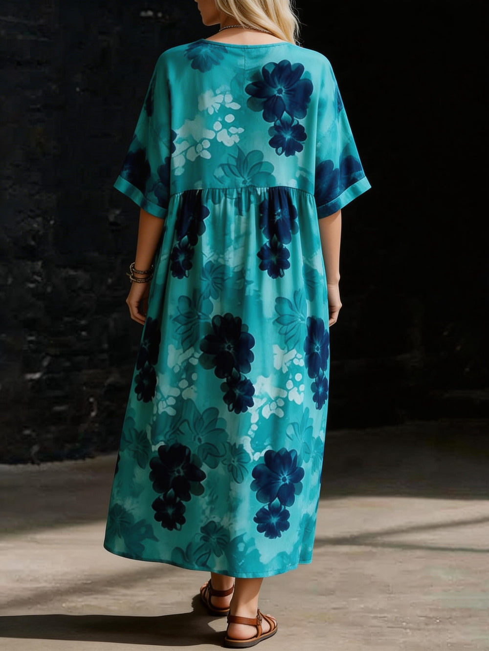 Blue Watercolor Floral Short Sleeve Loose Dress