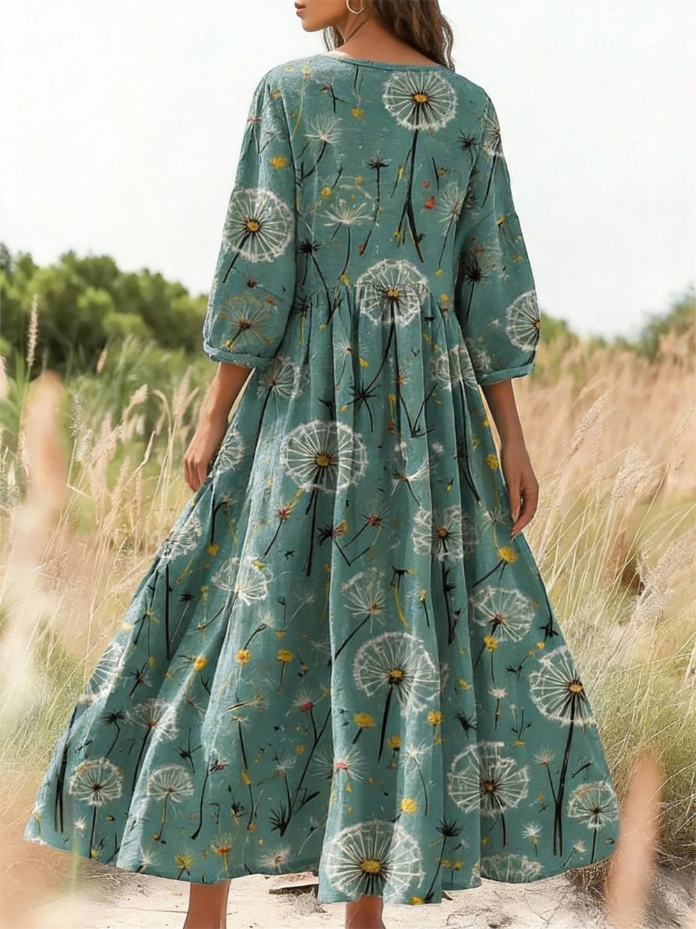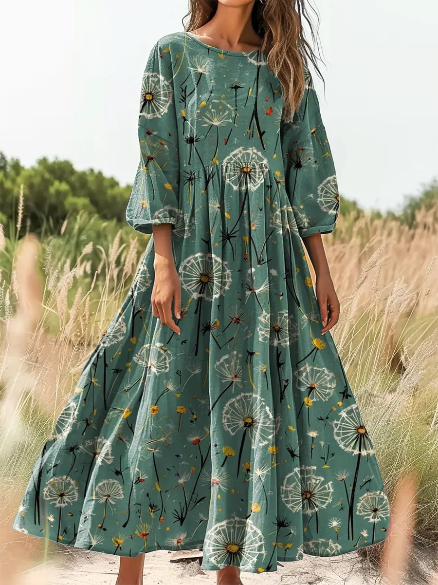 Vintage Pastoral Dandelion Print Pocket Dress