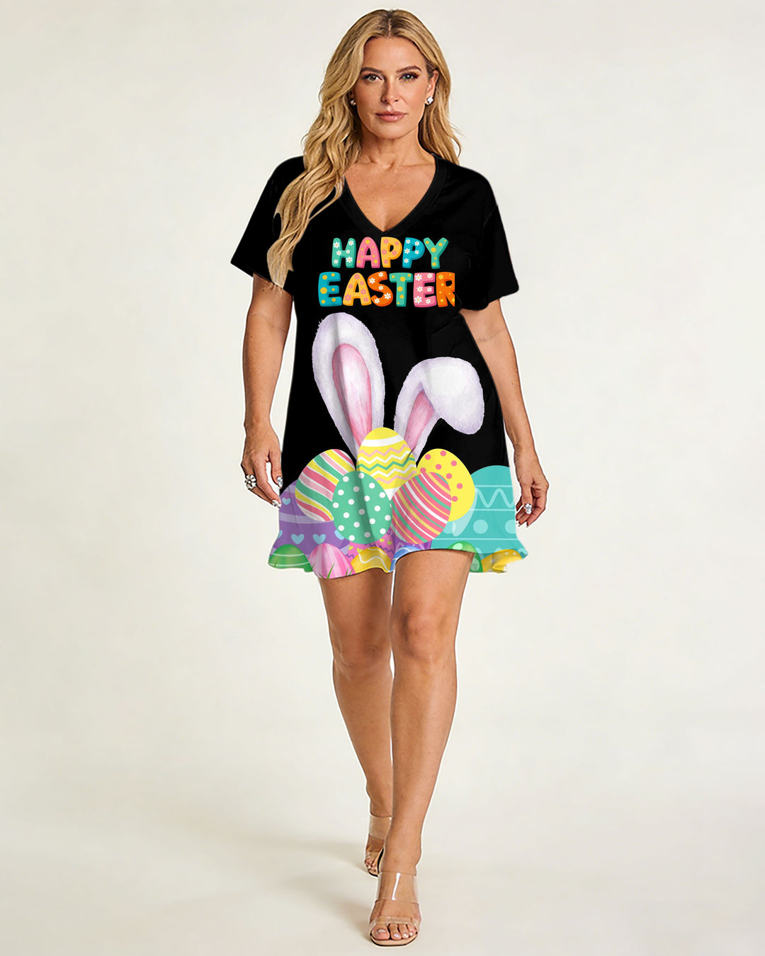 Easter Bunny & Egg Print V-Neck Mini Dress
