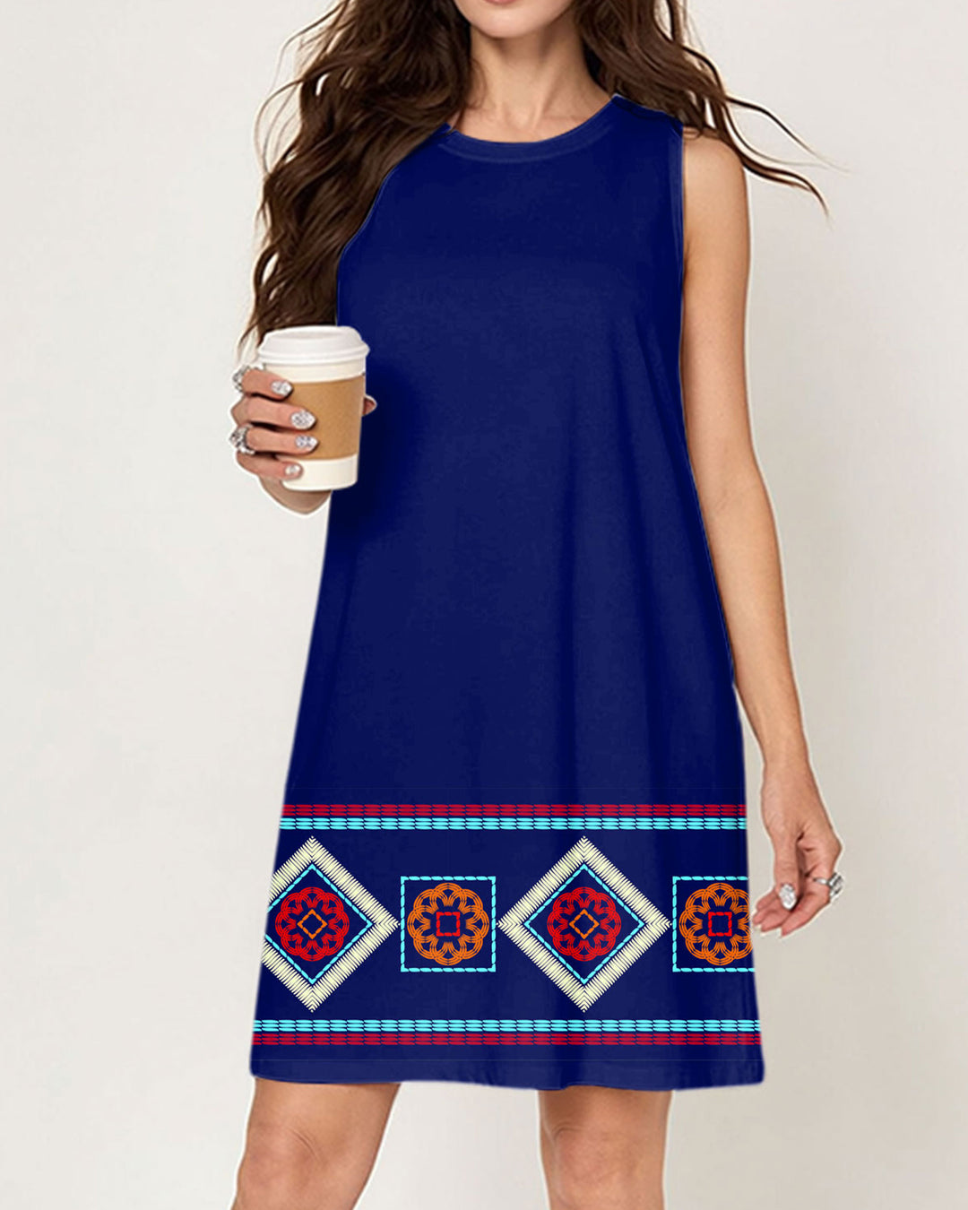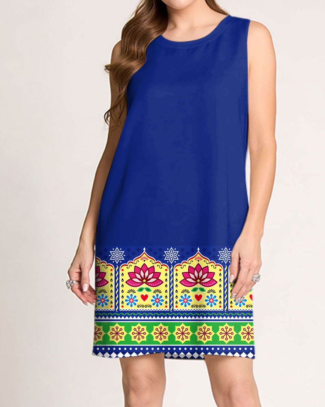 Spring And Summer Blue And Green Pattern Printed Sleeveless Dress