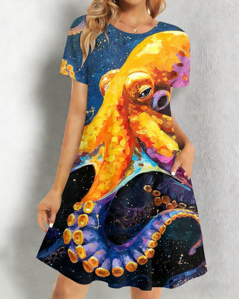 Octopus Oil Painting Art Round Neck Short Sleeved Pocket Midi Dress