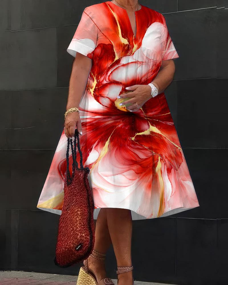 Red Floral Stripe Art Print Daily Loose Plain Shirt Dress